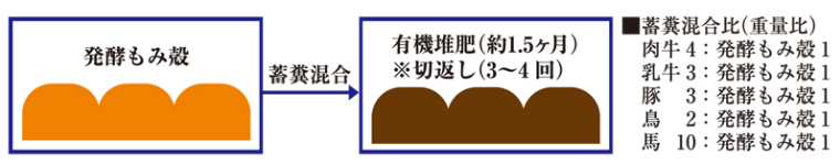 ②二次的な発酵産物である発酵もみ殻と混ぜるだけでも、糞尿の悪臭軽減は日にちの経過とともに著しく変化した。