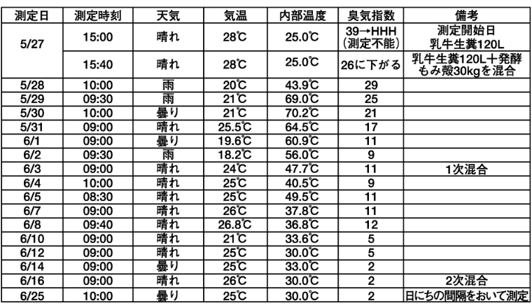 ①悪臭がひどいことで有名な乳牛の生糞を、発酵もみ殻と混合した後、日にち経過に伴うにおいの軽減状況を