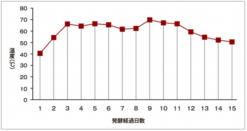 ●発酵もみ殻と混ぜるだけでその数値が著しく低下し「26」、測定一週間目に「9」、2週間目に「5」、その後は