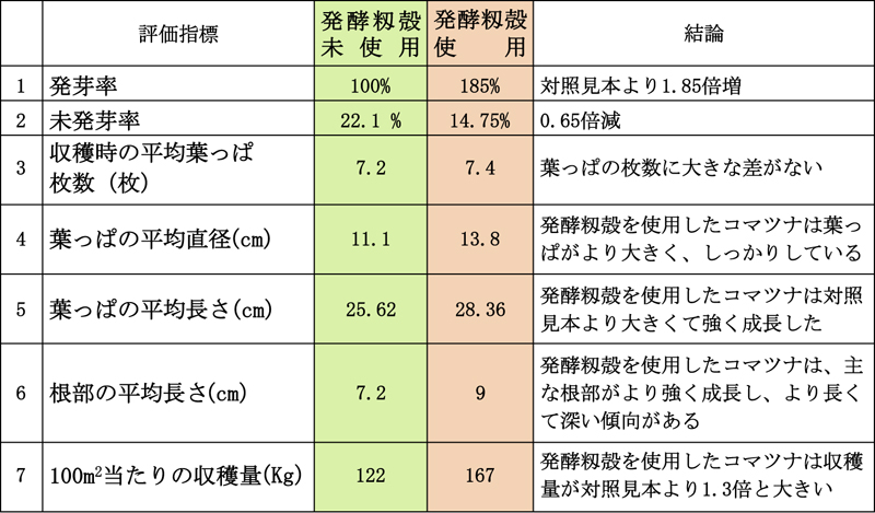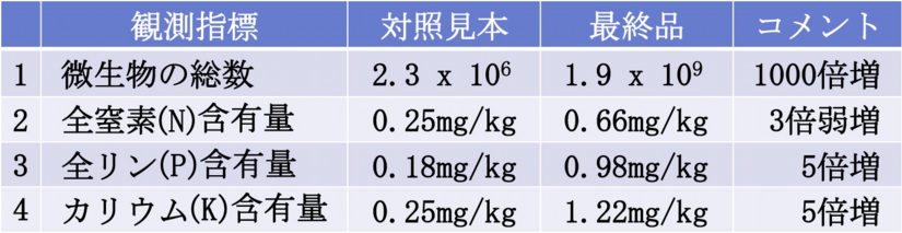 使用前と発酵もみ殻を使用して2週間経過した土壌の変化を、成分で比較したものです。