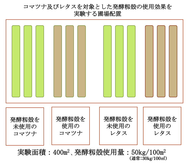 A-左:発酵もみ殻未使用のコマツナ●●●B-左:発酵もみ殻未使用のコマツナの根部
