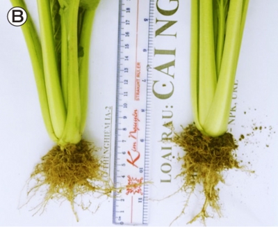 ●●A-右:発酵もみ殻を使用したレタス●●B-右:発酵もみ殻を使用したのレタスの根部